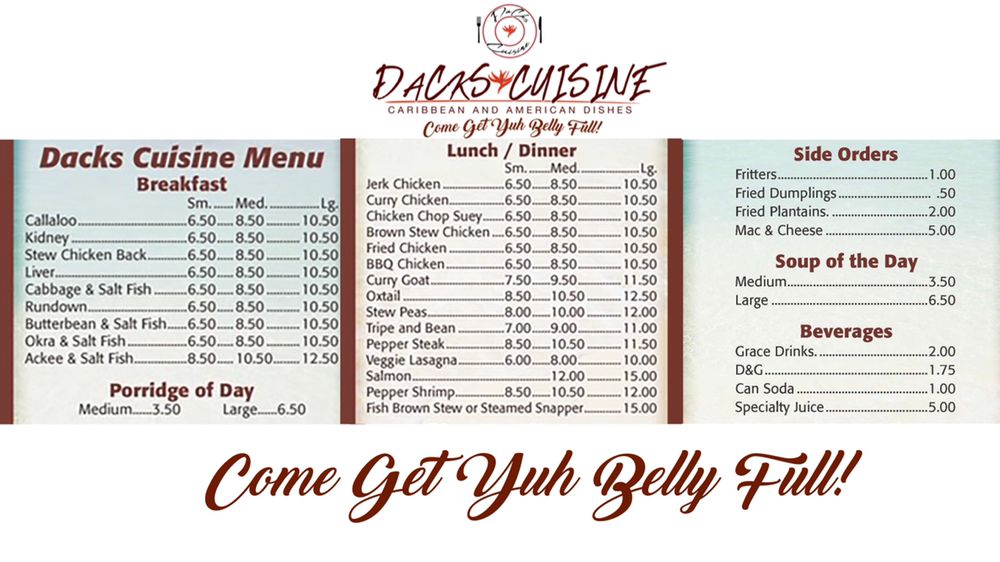 Welcome to Dacks Cuisine, a Caribbean culinary gem located in the Bronx. Known for its vibrant and flavorful dishes, this restaurant promises an unforgettable dining experience. From savory Ackee and Saltfish for breakfast to mouthwatering mains like Jerk Chicken and Oxtail Tacos, each dish is crafted with love and authenticity.